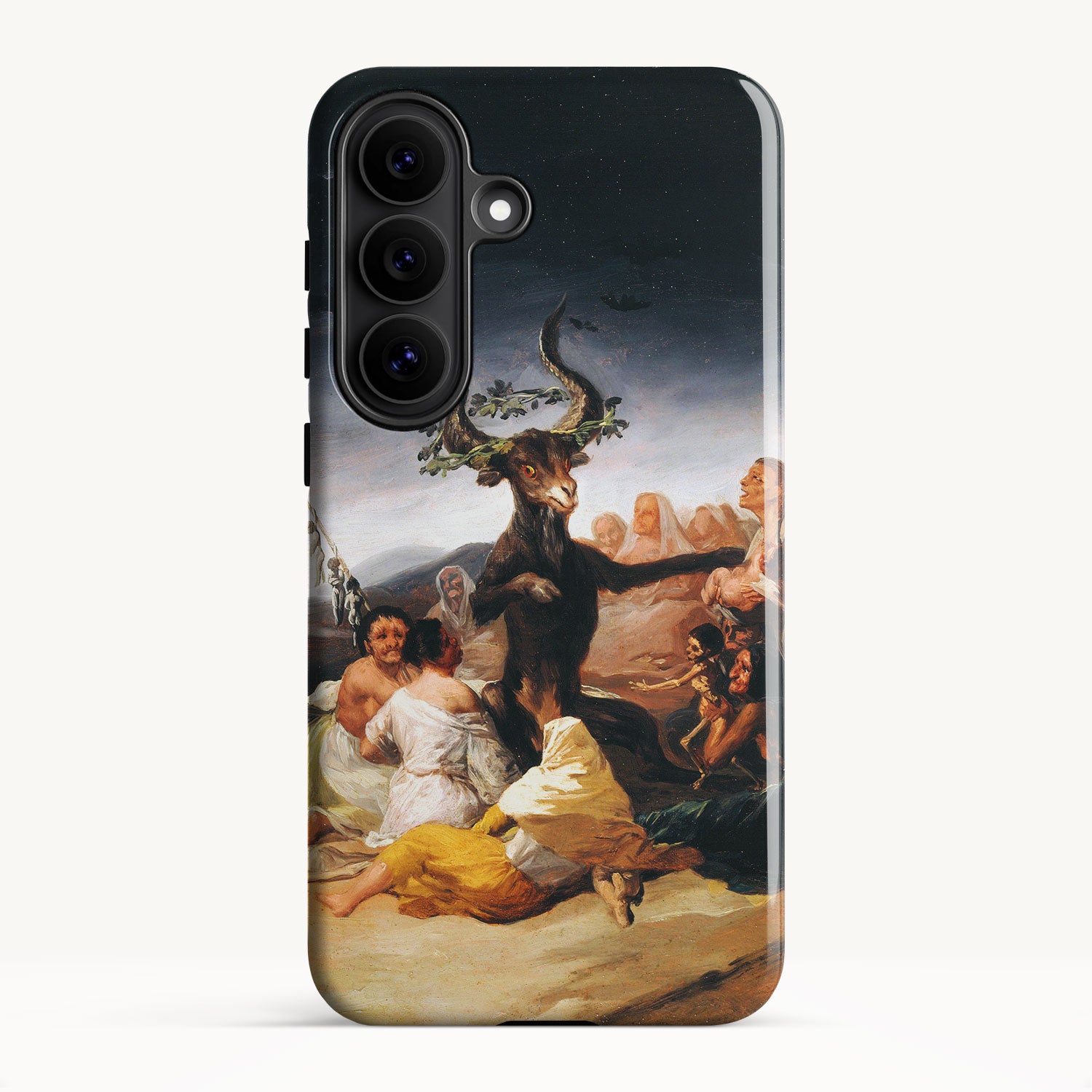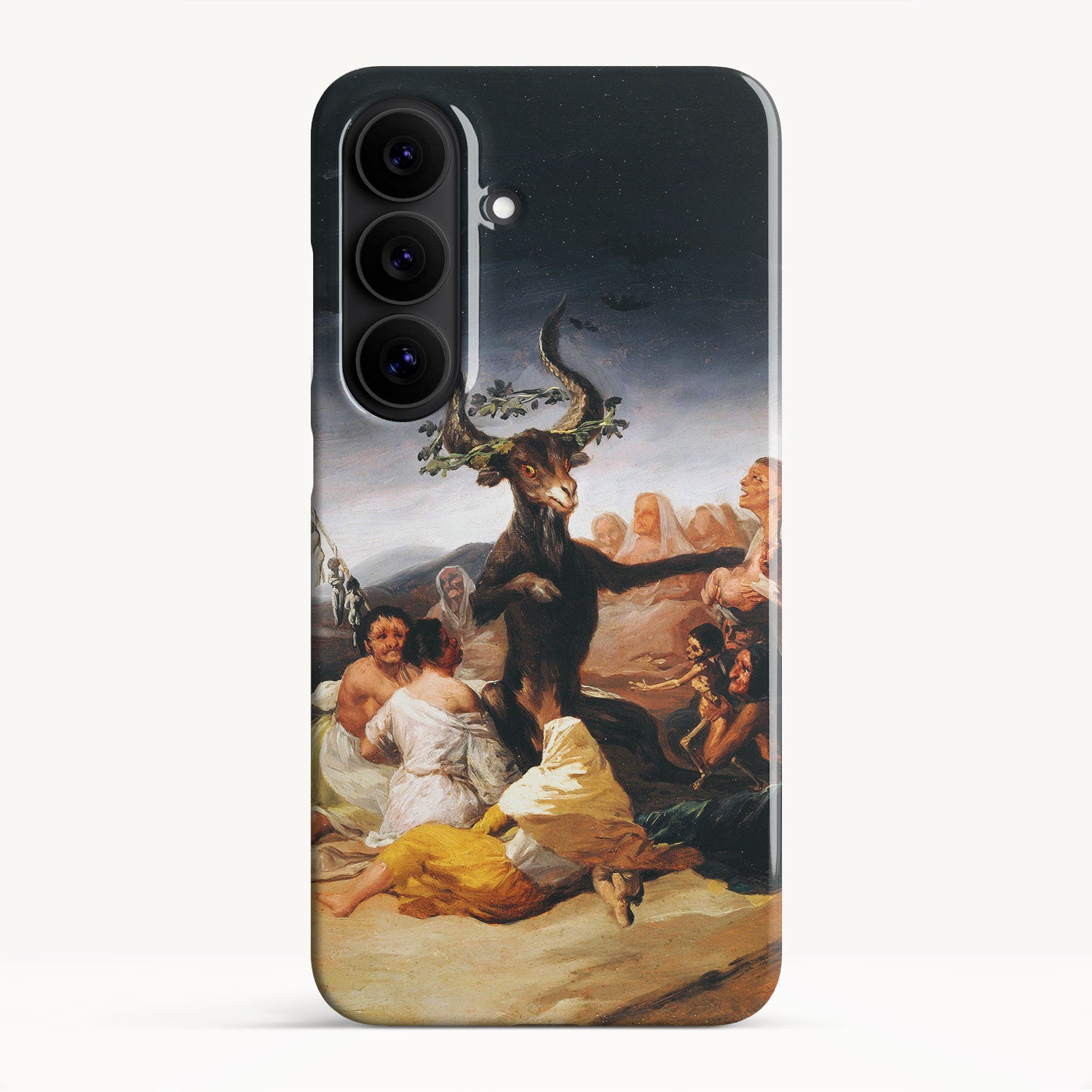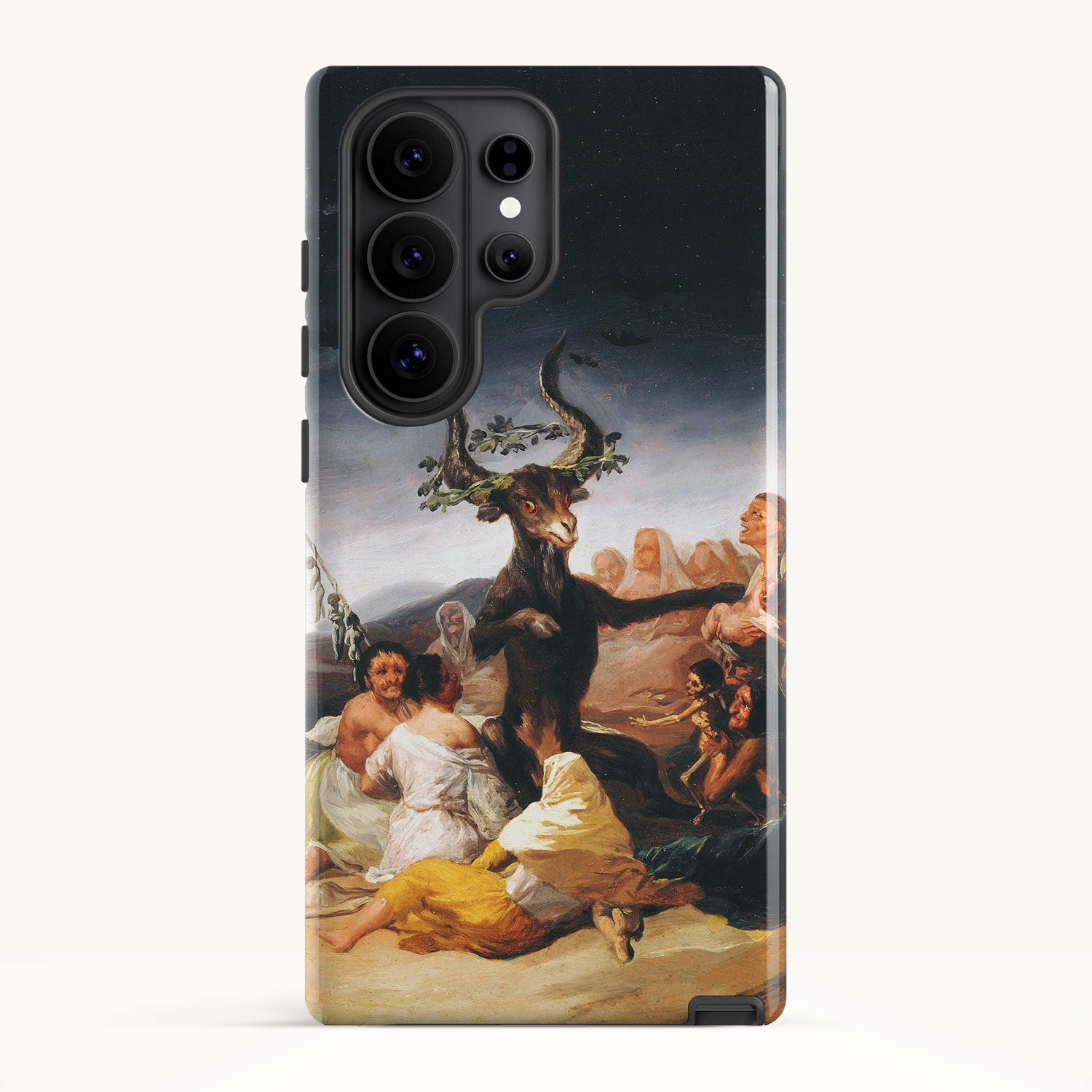 In the painting, Goya depicts a moonlit gathering of witches in a desolate landscape, engaged in an occult ritual and feeding infant souls to a goat-like figure with large horns.