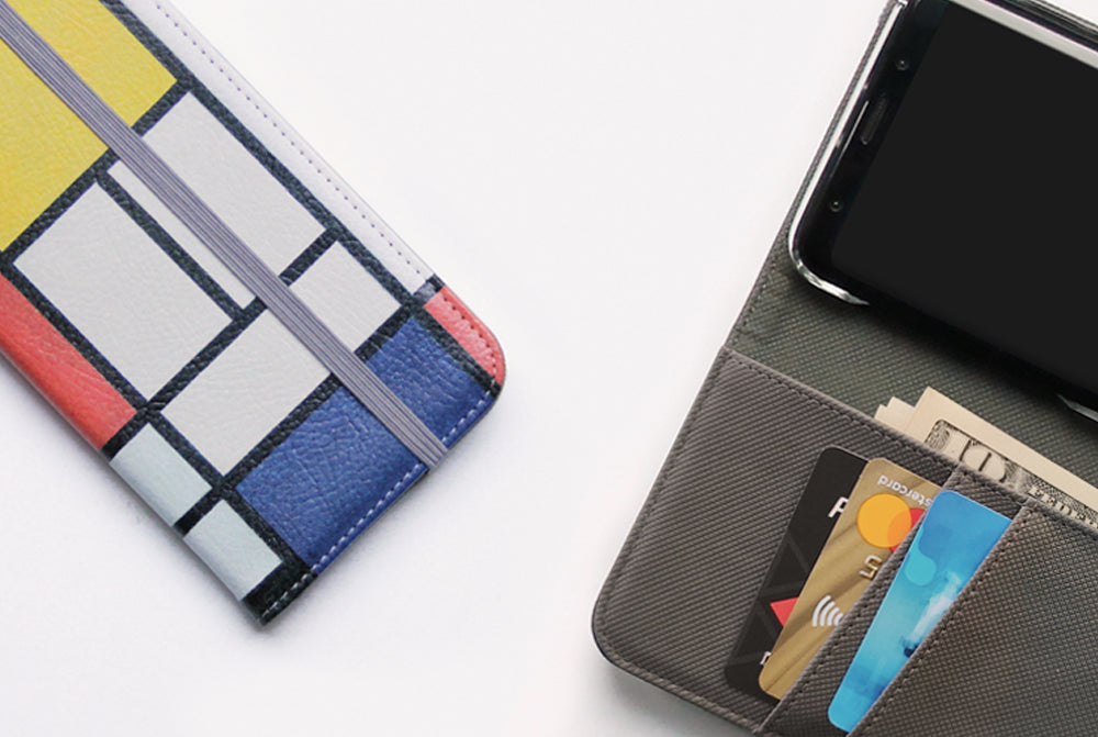 Elegant faux-leather folio with hard plastic case inside and an elastic strap. A convenient way to carry your phone, credit and membership cards, ID and cash - all at once.